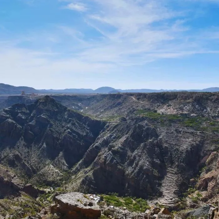 Morning: After breakfast, embark on a private tour to visit Muscat's Grand Mosque. Admire its stunning Islamic architecture and beautiful interiors. Continue to Barka to visit the fish and vegetable market, followed by a stop at Nakhal village to explore the hot springs and date plantations. Afternoon: The adventure continues with a scenic off-road drive through Wadi Bani Awf. Enjoy stops at mountain villages and breathtaking cliff views as you travel towards Jabal Shams, the “Mountain of the Sun.” Check-in at Jabal Shams Resort for dinner and overnight stay.